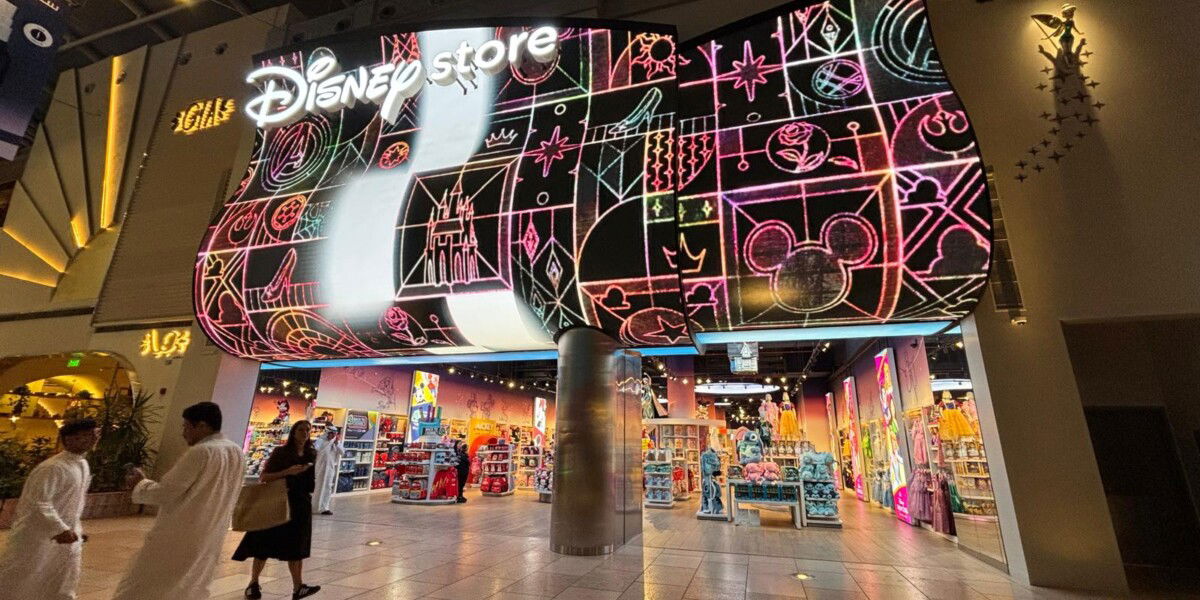 The Disney Store at The Avenues offers a fully immersive 360-degree experience. Above the main entrance, a grand screen shaped like a scroll frames the doorway, projecting scenes from classic Disney films that create a sense of timeless enchantment the moment you approach. Bathed in a luminous, welcoming glow, the façade blends sleek modern architecture with theatrical whimsy—bold signage featuring the iconic Disney logo arches gracefully over the storefront. Crisp blue accents and gentle lighting add elegance and sparkle, while subtle playful motifs hint at the beloved characters and stories within. Set against the upscale backdrop of The Avenues, the store transcends its role as a retail space to become a radiant beacon of nostalgia, delight, and immersive fantasy.