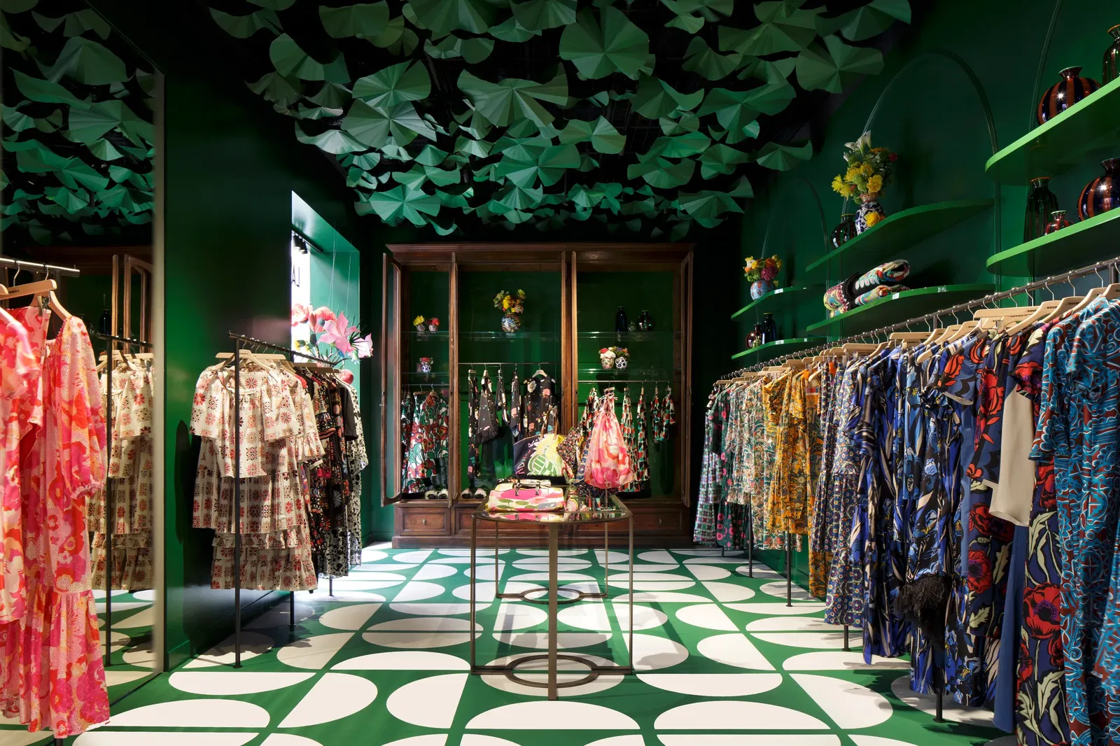 Nestled in Milan’s prestigious luxury district, J.J. Martin’s flagship store for La DoubleJ is a delightful haven that exudes cheerfulness. The ground-floor space welcomes visitors with a whimsical display of green paper lily pads suspended from the ceiling, mirroring the playful pattern of 1960s-inspired circles adorning the tiled floor. Martin’s vibrant and print-clashing clothing line beckons from the racks, urging customers to embrace the joyful spirit of self-expression.