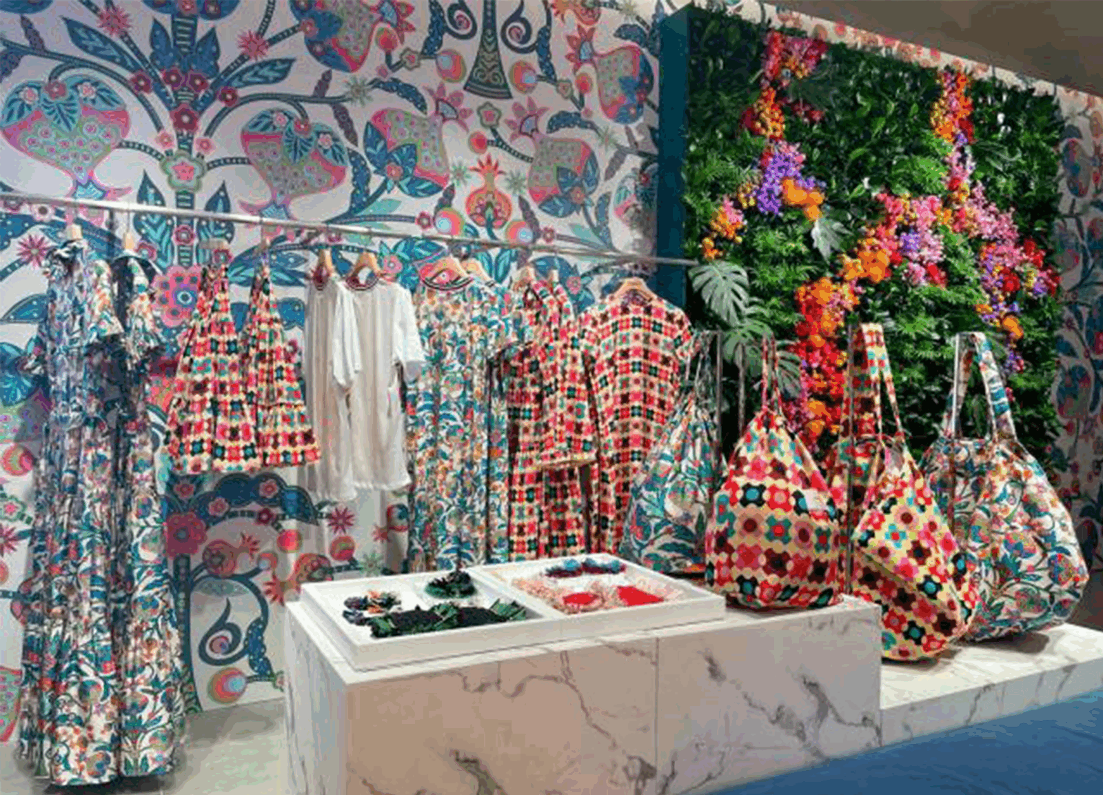 In an adjacent room, the ambiance shifts to one of conviviality and creativity. Porcelain pieces, tablecloths, and cushions adorn the space, inviting customers to envision hosting their own dinner parties. The riotously attired table sets the stage for lively conversations filled with mischievous jokes and clever banter. The entire experience at La DoubleJ’s flagship store captures the essence of Martin’s design philosophy—embracing the power of colour, pattern, and whimsy to bring joy and playfulness into everyday life.