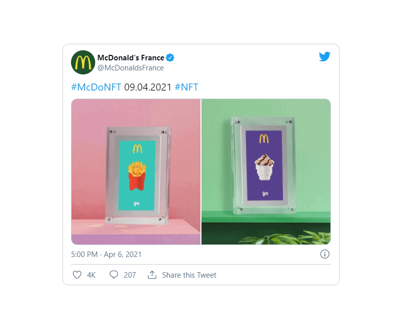Similarly, in April, McDonald’s launched NFTs for iconic menu items which its social media followers could win upon entering a competition. Using the hashtag #McDoNFT, the initial Instagram post (later followed by a Twitter post the week after) generated over 7,000 likes.