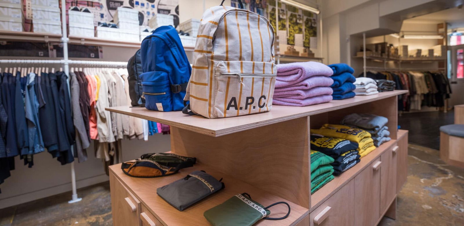 From its original distressed concrete and restored wooden flooring, Kee Klamp shelving, and āWild Posterā graphics inspired by retro A.P.C. material palettes,to its newly painted exterior which is reflective of its historic surrounds and conforms to the decrees of its listed status, this Park Street boutique flaunts an industrial-luxe interior with a touch of heritage.