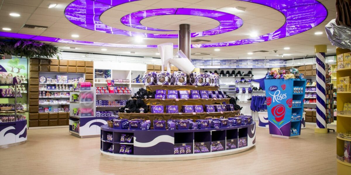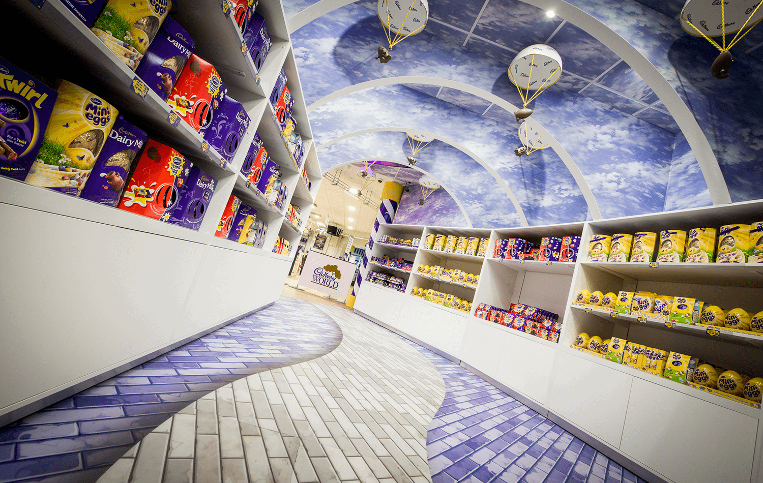 sense of literally being within the world of Cadburys chocolate. Strategically placed chuckle bean characters add depth to this brand storytelling, engaging with consumers of all ages visiting the store.