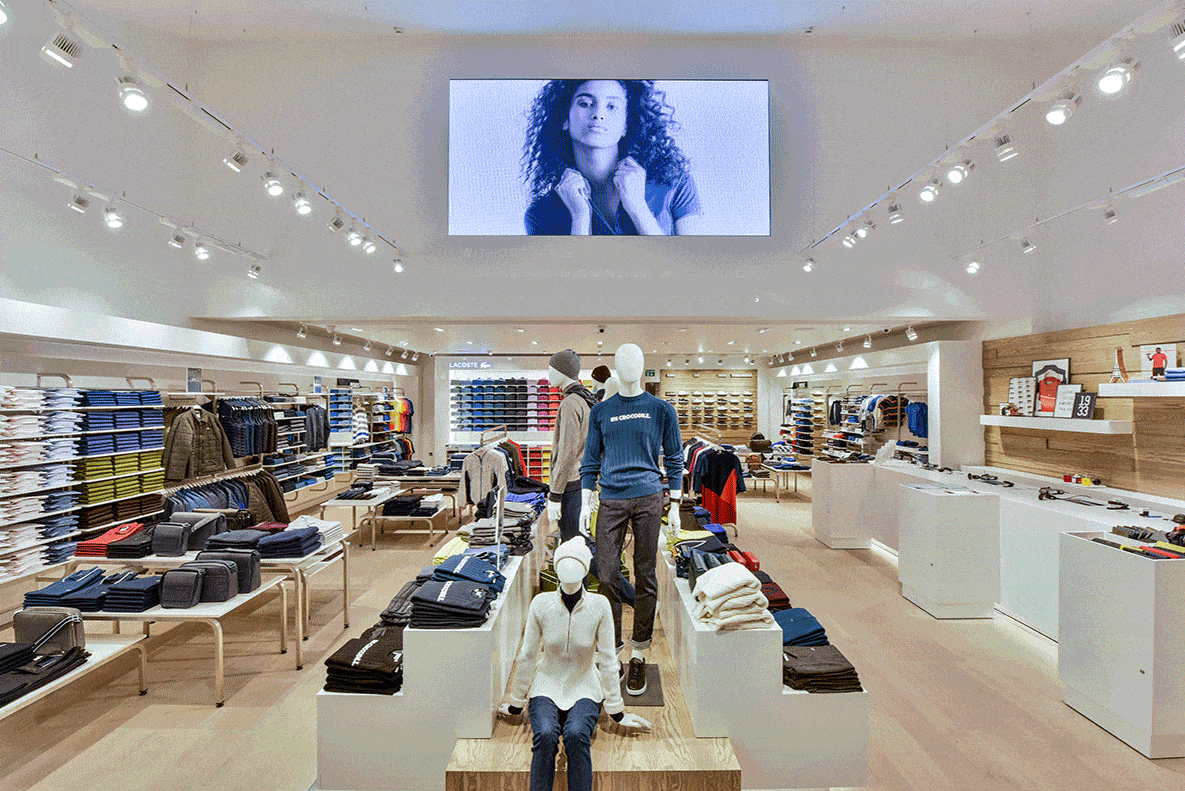 catwalk central to the store creates a point of difference for this boutique, authenticating Lacoste as a fashion-forward brand despite its sports background. However, this heritage is not forgotten with aĀ large digital screenĀ focused on the Lacoste story, creating dynamic branded content on display to the consumer.