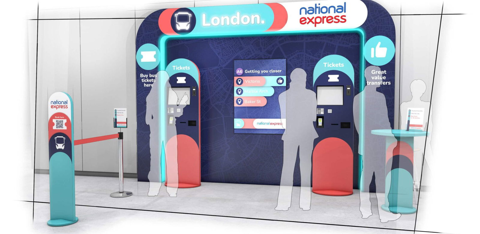We presented three concept routes exploring contrasting variations of look and feel. Once the concept was chosen and refined, we built a simple, accessible, and direct retail toolkit based on key strategic themes including tone of voice and colour palette. The navigational comms were soft, friendly and approachable, balancing persuasive messaging and positive perceptions of coach travel and National Express. The colour palette consisted of National Express’ timeless branding while offering a fresh feel to garner engagement with passengers.
