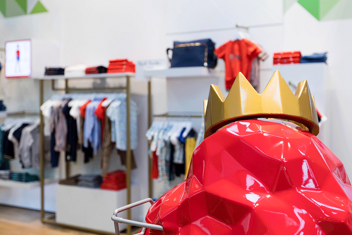 The adaptable eco-system of the Savanna creates flexibility and fluidity, uncovering opportunities for easy changes in-store with each season and new brand launch. However, it is the geometric animals which steal the show in this luxury fashion store. From the majestic red lion finished with a gold crown through to the baseball-cap wearing monkey